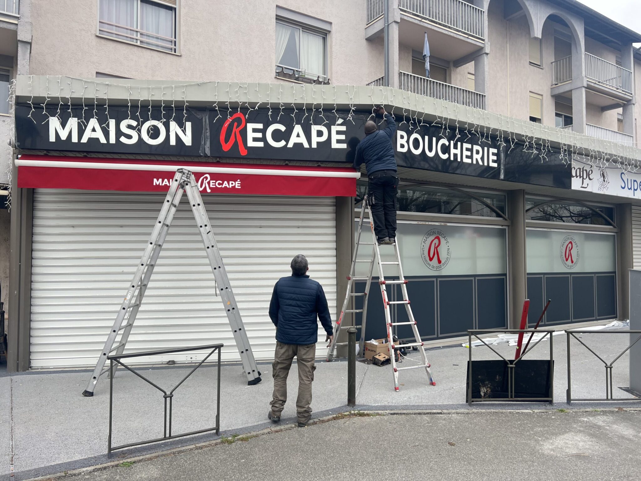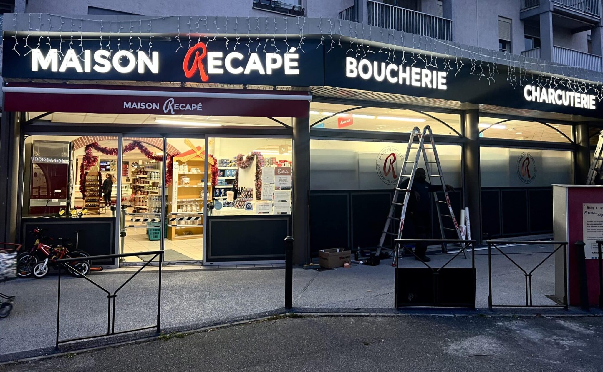 Afin d’optimiser la façade de cette Boucherie nous avons réalisé la fabrication et la pose d’une enseigne lumineuse texte évidé de 14 mètres de long. Le texte a été découpé dans des tôles aluminium teinté masse noir mat et éclairé de l’intérieur par modules Led haute luminosité et plaques plexiglas blanc diffusantes. Cette technique de fabrication permet un éclairage direct du texte de vos enseignes. Les tôles ont été pliées aux quatre bords pour une fixation de qualité sur la tranche des bacs aluminium et pas sur la face des enseignes lumineuses.