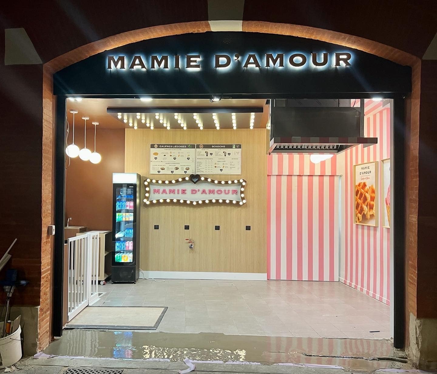Afin d’améliorer l’efficacité visuelle du restaurant nous avons réalisé en plus de l’enseigne lumineuse extérieure la fabrication et la pose d’une enseigne lumineuse intérieure et plafond lumineux ampoules Led. Le contour de l’enseigne lumineuse a été réalisé en aluminium formé et laqué marron, les lettres du texte Mamie d’Amour en PVC 19 mm laquées rose. La technologie Led, au delà d’une consommation très faible en électricité, a permis des association de matières originales, modernes et efficaces afin de vous proposer des enseignes lumineuses impactantes et adapter à votre identité visuelle.
