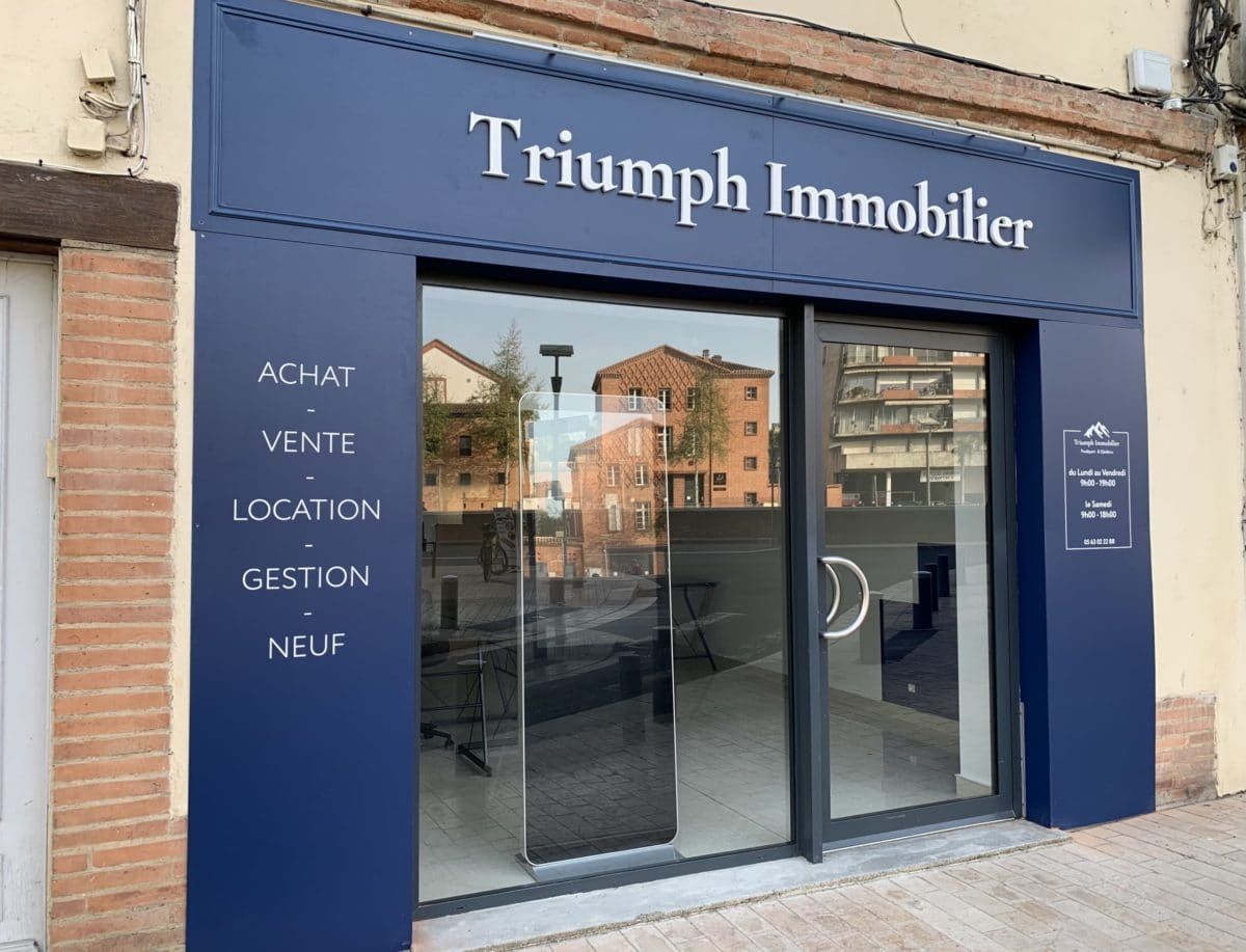 Réalisation d’un habillage façade et enseigne lumineuse pour l’agence immobilière Triumph Immobilier à Montauban.