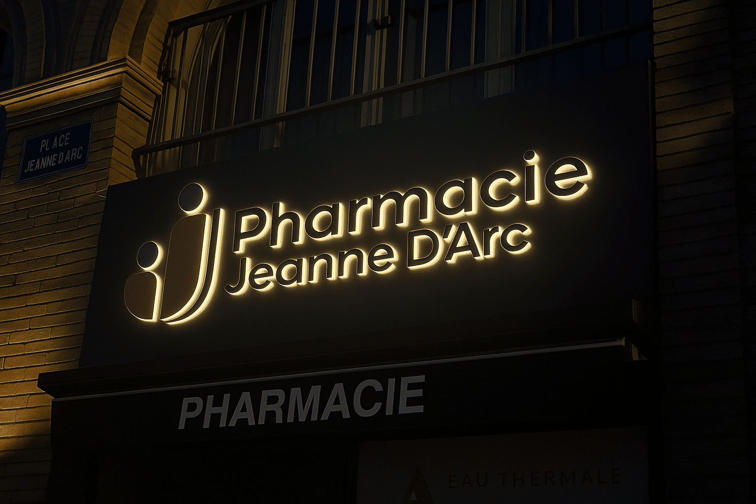 Dans le cadre de notre dernière intervention, nous avons eu le plaisir de collaborer avec la Pharmacie Jeanne d’Arc, située à Toulouse, pour la réalisation complète de ses enseignes lumineuses. L’objectif : améliorer la visibilité de l’officine tout en respectant les codes esthétiques et professionnels du secteur pharmaceutique.