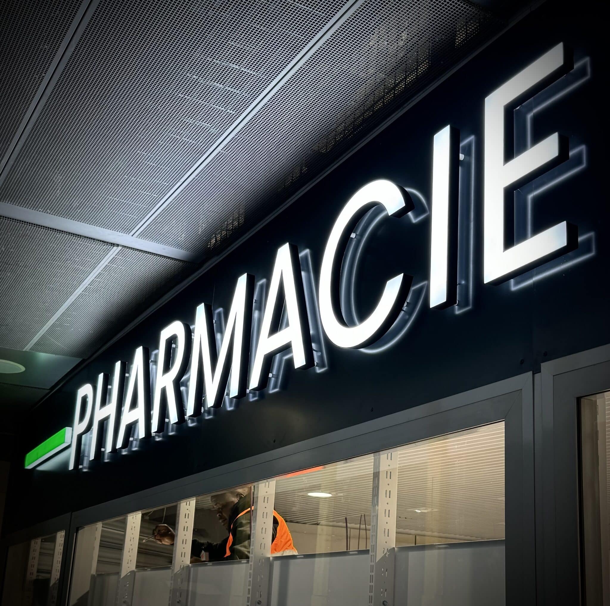 Les enseignes en lettres boîtiers plexiglas sont des solutions lumineuses modernes et haut de gamme, idéales pour les pharmacies souhaitant allier visibilité et esthétique. Chaque lettre est réalisée en volume à partir de plexiglas diffusant, avec une face et une tranche personnalisables, pouvant être de couleurs identiques ou différentes selon le rendu souhaité. L’intérieur intègre des modules LED basse consommation permettant un éclairage homogène et durable, configurable en face, en tranche ou sur les deux pour un impact visuel renforcé. La fabrication est entièrement sur mesure afin de s’adapter à chaque identité visuelle et aux contraintes techniques. Les lettres peuvent être fixées directement sur la façade avec un câblage dissimulé, ou installées sur une lisse en aluminium permettant de rendre les alimentations invisibles, celle-ci étant thermolaquée à la couleur de la façade pour une intégration parfaite. Ce type d’enseigne offre ainsi une grande liberté de personnalisation tout en garantissant une excellente lisibilité de jour comme de nuit.